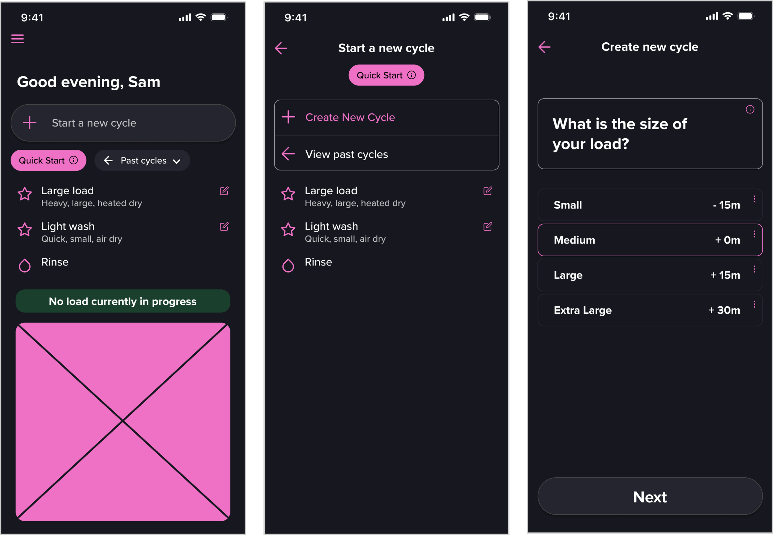 After developing my wireframes, I did user testing that informed my decisions going forward. I received feedback that I should include progress indicators and make the “Next” buttons more noticeable when an option is clicked. I also was told that the “Start a new cycle” page was redundant, and could be omitted.