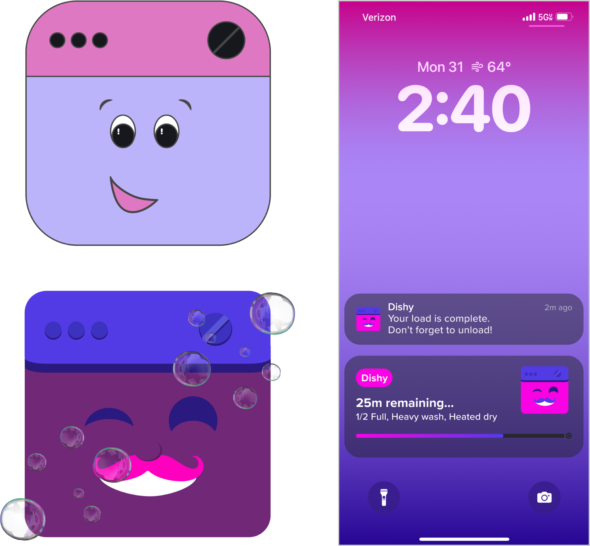 Going back to the Lyft illustration style, I refined the dishwasher icon significantly. I also included a prototype of some lock screen notifications. I refined small details, and added a bubble animation while a load is in progress.