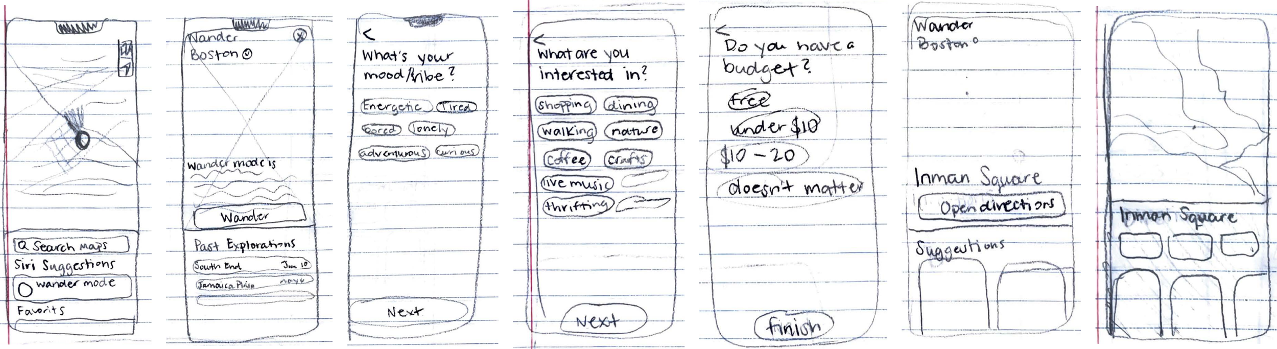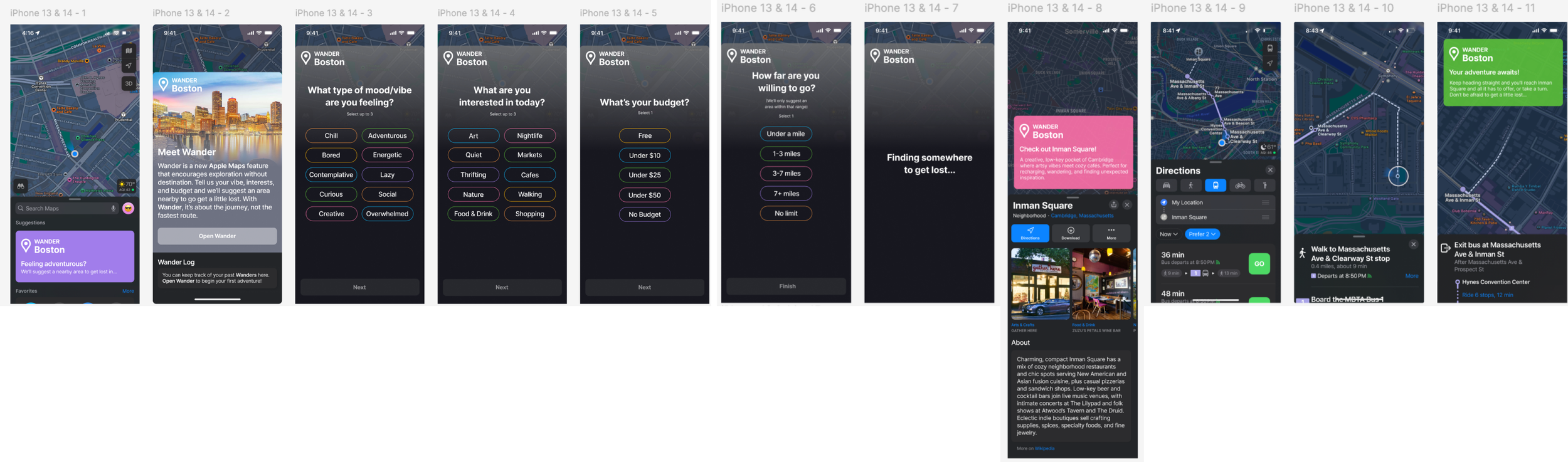 PROPOSAL: Wander — an Apple Maps feature that takes users through a quick survey asking the user about their mood/vibe, interests, budget and radius to determine an area nearby to explore. It drops them off at a starting point, lightly guiding them towards the given area. It will highlight a couple things for the user to do if they want to based on the survey.